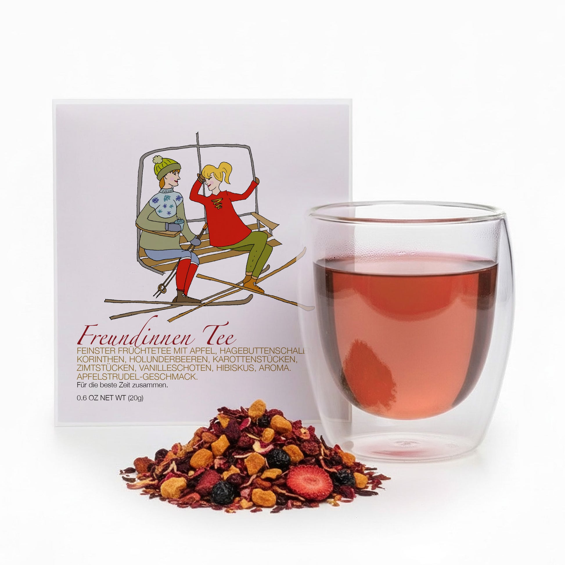 FEINSTER FRÜCHTETEE MIT APFEL, HAGEBUTTENSCHALEN, KORINTHEN, HOLUNDERBEEREN, KAROTTENSTÜCKEN, ZIMTSTÜCKEN, VANILLESCHOTEN, HIBISKUS, AROMA. APFELSTRUDEL-GESCHMACK.